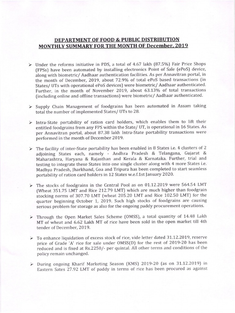 portability of ration card holders in l-2 States w.e.i1st January 2020.