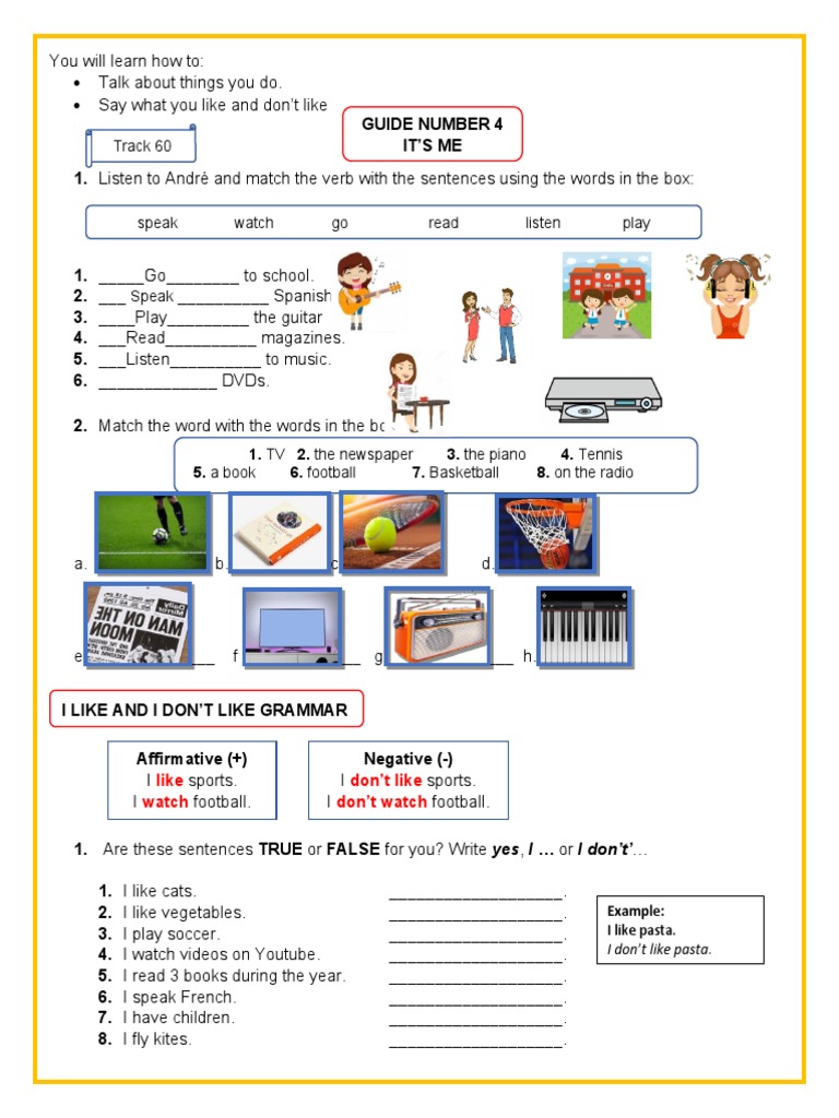 1. Listen to André and match the verb with the sentences using the words in the box: