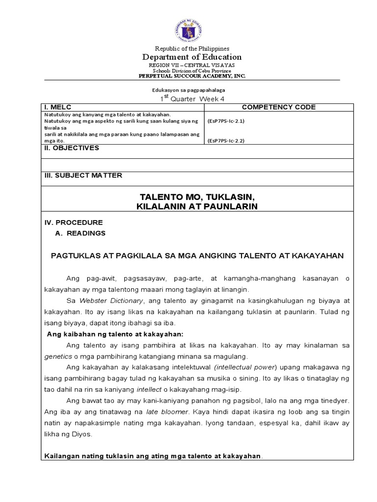 mga ito. (EsP7PS-Ic-2.2)