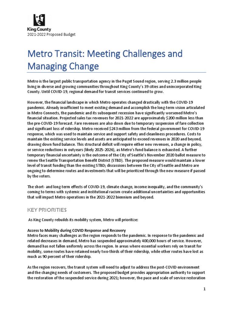 Metro is the largest public transportation agency in the Puget Sound region, serving 2.3 million people living in diverse and growing communities throughout King County’s 39 cities and unincorporated King County. Until COVID-19, regional demand for transit services continued to grow. However, the financial landscape in which Metro operates changed drastically with the COVID-19 pandemic. Already insufficient to meet existing demand and accomplish the long-term vision articulated in Metro Connects, the pandemic and its subsequent recession have significantly worsened Metro’s financial situation. Projected sales tax revenues for 2021-2022 are approximately $200 million less than the pre-COVID-19 forecast. Fare revenues are also down due to temporary suspension of fare collection and significant loss of ridership. Metro received $243 million from the federal government for COVID-19 response, which was used to maintain service and support safety and cleanliness procedures. Costs to maintain the existing service levels and assets are anticipated to exceed revenues in 2020 and beyond, drawing down fund balance. This structural deficit will require either new revenues, a change in policy, or service reductions in outyears (likely 2025-2026), as Metro’s fund balance is exhausted. A further temporary financial uncertainty is the outcome of the City of Seattle’s November 2020 ballot measure to renew the Seattle Transportation Benefit District (STBD). The proposed measure would maintain a lower level of transit funding than the existing STBD; discussions between the City of Seattle and Metro are ongoing to determine routes and investments that will be prioritized through the new measure if passed by the voters.
