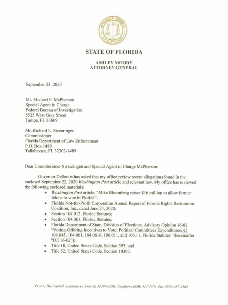 STATE OF FLORIDA ASHLEY MOODY ATTORNEY GENERAL. September 25, 2020 Mr. Michael F. MePherson Special Agent in Charge Federal Bureau of Investigation 5525 West Gray Street Tampa, FL 33609 Mr. Richard L. Swearingen Commissioner Florida Department of Law Enforcement P.O, Box 1489 Tallahassee, FL. 32302-1489 Dear Commissioner Swearingen and Special Agent in Charge MePherson: Governor DeSantis has asked that my office review recent allegations found in the enclosed September 22, 2020 Washingion Post article and relevant law. My office has reviewed the following enclosed materials: + Washington Post article, “Mike Bloomberg raises $16 million to allow former felons to vote in Florida”; ‘* Florida Not-for-Profit Corporation Annual Report of Florida Rights Restoration Coalition, Inc. dated June 23, 2020; ‘© Section 104.012, Florida Statues; ‘© Section 104.061, Florida Stat ‘+ Florida Department of State, Division of Elections, Advisory Opinion 16-02 ““Voting-Offering Incentives to Vote; Political Committees Expenditures; §§ 104.045, 104.061, 104.0616, 106.011, and 106.11, Florida Statues" (hereinafter “DE 16-02"), ‘+ Title 18, United States Code, Section 597; and ‘© Title 52, United States Code, Section 10307. PLO}, The Copito Tallahsse, Flor 32399-1050, Telephone (950) 414-3300 Fas (450) 487-2564 In DE 16-02, the Florida Department of State, Division of Election, in responding to an inquiry by a politcal committee, stated: Even otherwise innocuous offering of an incentive simply to vote could run afoul of section 104.045 or section 104.061, or both, pending upon the circumstances involved. That is, incentives could be offered fo a voter in a way that would be designed to directly or indirectly cause the voter ora larger group of voters to vote in a particular manner. In such a case, the person giving the incentive could be guilty of violating section 104.061, Florida Statutes, which makes it illegal to “directly or indirectly give or promise anything of value to another in casting his or her vote.” DE 16-02, at 3 (footnote and citation omitted), After preliminarily reviewing this limited public information and law, it appears further investigation is warranted. Accordingly, I request that your agencies further investigate this ‘matter and take appropriate steps as merited Sincerely, Attomey General ccc: Mrs. Maria Chapa Lopez, United States Attomey Mr, Nick Cox, Statewide Prosecutor The Washington Post Mike Bloomberg raises $16 million to allow former felons to vote in Florida 5) Michael Scherar Septomibor 22,2020 at 10:50 a.m. EOT Former New York mayor Mike Bloomberg and his team have raised more than $16 milion to poy the court fines and fes of nearly 32,000 Black and Hispanie Frida voters with felony convictions, an effort aimed at boosting turnout for Democratic presidental eanldate Jo Biden “The money wll fnd a program organized bythe Florida Rights Restoration Coat o pay the fines, fees nd restitution cust for former prisoners who are alteady registered to vote in Florida ung debts. but barred by law from participating in the election because of those outs "Bloomberg, who has committed at least $100 milion to clectng Biden in the state, raised the ‘money from individuals and foundations ove the past week his advisers sid He sv the donations asa more cast-ffective way of adding votes tothe Democratic column than investing :money to persuade voters who already have the right o vote, a Bloomberg memo si. ‘We have identted a significant vote share that requires nominal investment," the men read. “The data shows that in Florida, Black voters area unique universe unlike any other voting blo, ‘where the Democratic support rate tends tobe 90%-35%." ‘The memo noted that Biden was polling worse among Cuban American voters than Hillary cc nton, the 2016 nominee, while winning other Hispanic groups by margin of 0, ‘The Florida Rights Restoration Coalition ia nonpartisan group that has been fundraising to return al former felons in the state to the voting rolls. Desmond Meade, the group's president std the group doesnot share Bloombergs goal of empowering only one politcal side inthe ‘upcoming lection, "Different people may give for different reasons, but we aren this for one reason and that reason, isto place people oer polities,” Meade said. "Weare concerned with people fom all walks fife, from al sorts of polities” esa that through separate efforts, his organization has raised about $7 milion fom about 44,000 donors to help pay the debts of ciizens with felony’ convitions so they can return tothe voting roll The average debt, the group sai, is about $1,000. ‘ter organizing by Meade's group, Florida voters passed a statewide constitutional amendment in 2018 that gave former felons, except thse convicted of murder or felony sexual offenses, the ‘opportunity to vote in upcoming elections. The Republican-contolled legislature subsequently turn to the voting rolls passed, and the Republican governor signed, a aw that colitioncd ‘onthe payment ofall fees, fines and restitution that were part oftheir sentence. Subsequent court challenges upheld he power ofthe legislature to condition voting right on the ayn resident Trump asa possible replacement for Supreme Court justice Ruth Rader Ginsburg, cast nt of debts by former felons sdge Barbara Lagos, who is unde consideration by 2 concuring opinion on the mth Cieelt Court of Appeals upholding the state la requiting payment of debs ‘The Republican effort is expected to limit what some viewed asa politi benefit to Democrats of the constitutional change, which passed by ballot initiative with 65 pereent suppor. A study by the University of Florida found that nearly 775,000 former felons still owed money elated to ‘thee convitions and would be barred from the voting booth by the la. The vast jority are too poor to pay ther outstanding debts, according to evidence presented in court documents challengi