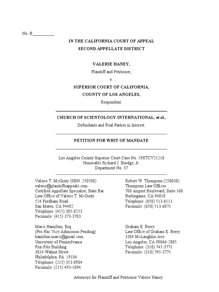 Los Angeles County Superior Court Case No. 19STCV21210 Honorable Richard J. Burdge, Jr. Department No. 37 Valerie T. McGinty (SBN: 250508) Robert W. Thompson (250038) valerie@plaintiffsappeals.com Thompson Law Offices Certified Appellate Specialist, State Bar 700 Airport Boulevard, Suite 160 Law Office of Valerie T. McGinty Burlingame, CA 94010 524 Fordham Road Telephone: (650) 513-6111 San Mateo, CA 94402 Facsimile: (650) 513-6071 Telephone: (415) 305-8253 Facsimile: (415) 373-3703 Marci Hamilton, Esq. Graham E. Berry (Pro Hac Vice Admission Pending) Law Office of Graham E. Berry hamilton.marci@gmail.com 3384 McLaughlin Ave. University of Pennsylvania Los Angeles, CA 90066-2005 Fox-Fels Building Telephone: (310) 745-3771 3814 Walnut Street Facsimile: (310) 745-3771 Philadelphia, PA 19104 Telephone: (215) 353-8984 Facsimile: (215) 493-1094 Attorneys for Plaintiff and Petitioner Valerie Haney