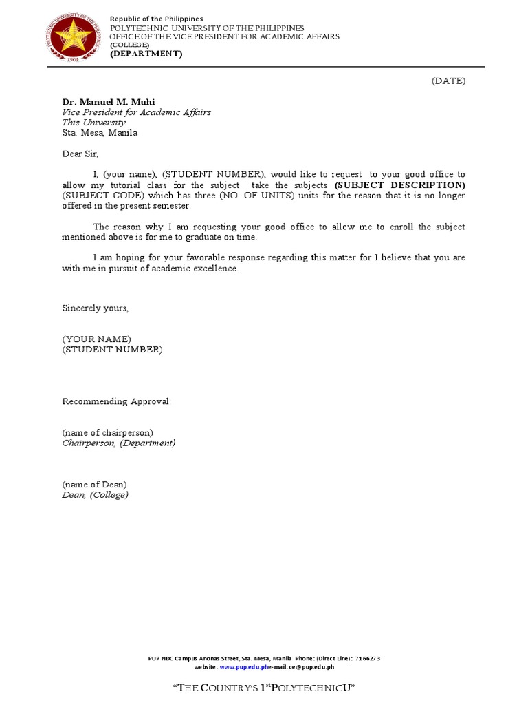 I, (your name), (STUDENT NUMBER), would like to request to your good office to