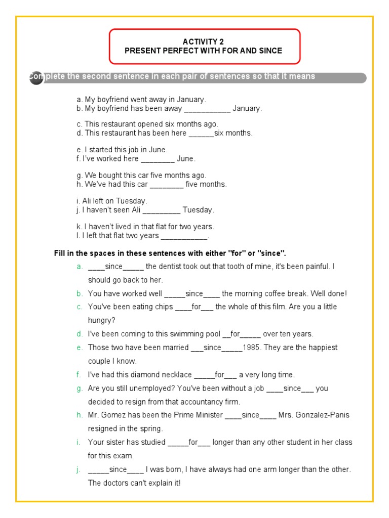 2. _____have_______ you ______seen___ (see) Mary and Tom FOR / SINCE