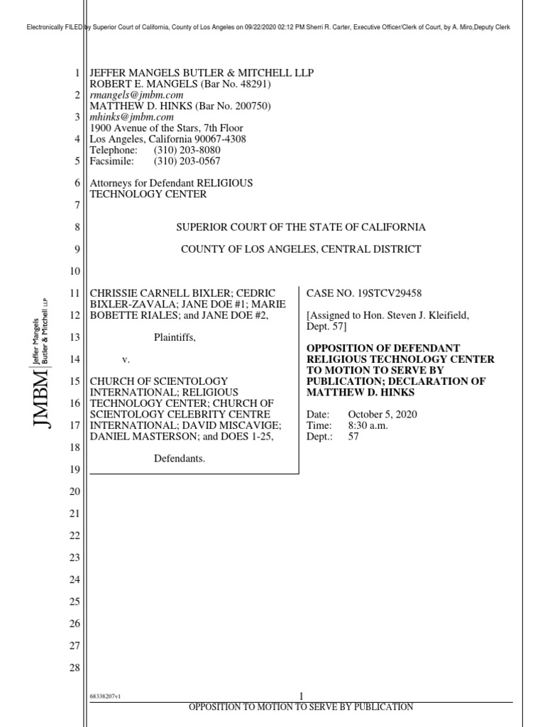 1900 Avenue of the Stars, 7th Floor Los Angeles, California 90067-4308 Telephone: (310) 203-8080 Facsimile: (310) 203-0567 Attorneys for Defendant RELIGIOUS TECHNOLOGY CENTER SUPERIOR COURT OF THE STATE OF CALIFORNIA COUNTY OF LOS ANGELES, CENTRAL DISTRICT CHRISSIE CARNELL BIXLER; CEDRIC BIXLER-ZAVALA; JANE DOE #1; MARIE BOBETTE RIALES; and JANE DOE #2, Plaintiffs, v. CHURCH OF SCIENTOLOGY INTERNATIONAL; RELIGIOUS TECHNOLOGY CENTER; CHURCH OF SCIENTOLOGY CELEBRITY CENTRE INTERNATIONAL; DAVID MISCAVIGE; DANIEL MASTERSON; and DOES 1-25, Defendants. CASE NO. 19STCV29458 [Assigned to Hon. Steven J. Kleifield, Dept. 57]