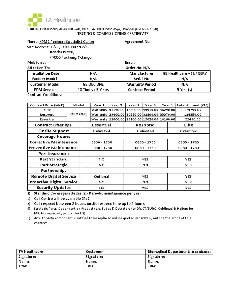 Customer Model GE OEC ONE Warranty Period N/A