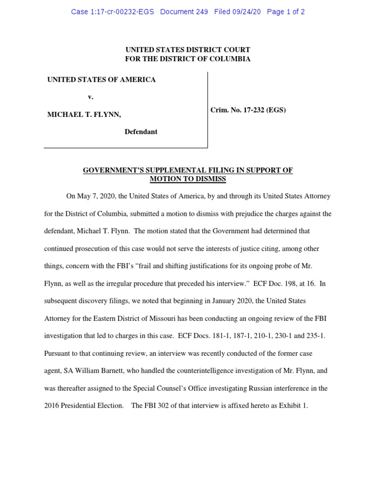 On May 7, 2020, the United States of America, by and through its United States Attorney for the District of Columbia, submitted a motion to dismiss with prejudice the charges against the defendant, Michael T. Flynn. The motion stated that the Government had determined that continued prosecution of this case would not serve the interests of justice citing, among other things, concern with the FBI’s “frail and shifting justifications for its ongoing probe of Mr. Flynn, as well as the irregular procedure that preceded his interview.” ECF Doc. 198, at 16. In subsequent discovery filings, we noted that beginning in January 2020, the United States Attorney for the Eastern District of Missouri has been conducting an ongoing review of the FBI investigation that led to charges in this case. ECF Docs. 181-1, 187-1, 210-1, 230-1 and 235-1. Pursuant to that continuing review, an interview was recently conducted of the former case agent, SA William Barnett, who handled the counterintelligence investigation of Mr. Flynn, and was thereafter assigned to the Special Counsel’s Office investigating Russian interference in the 2016 Presidential Election. The FBI 302 of that interview is affixed hereto as Exhibit 1.