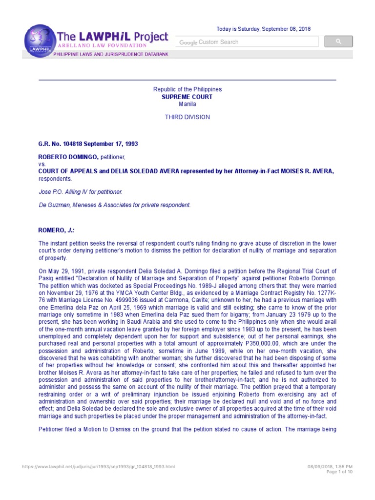 Pasig entitled "Declaration of Nullity of Marriage and Separation of Property" against petitioner Roberto Domingo.