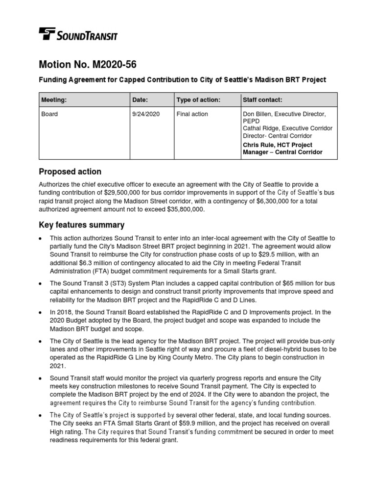 This action authorizes Sound Transit to enter into an inter-local agreement with the City of Seattle to partially fund the City's Madison Street BRT project beginning in 2021. The agreement would allow Sound Transit to reimburse the City for construction phase costs of up to $29.5 million, with an additional $6.3 million of contingency allocated to aid the City in meeting Federal Transit Administration (FTA) budget commitment requirements for a Small Starts grant.