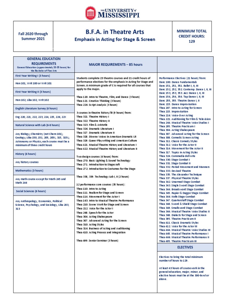 Fall 2020 through B.F.A. in Theatre Arts MINIMUM TOTAL
