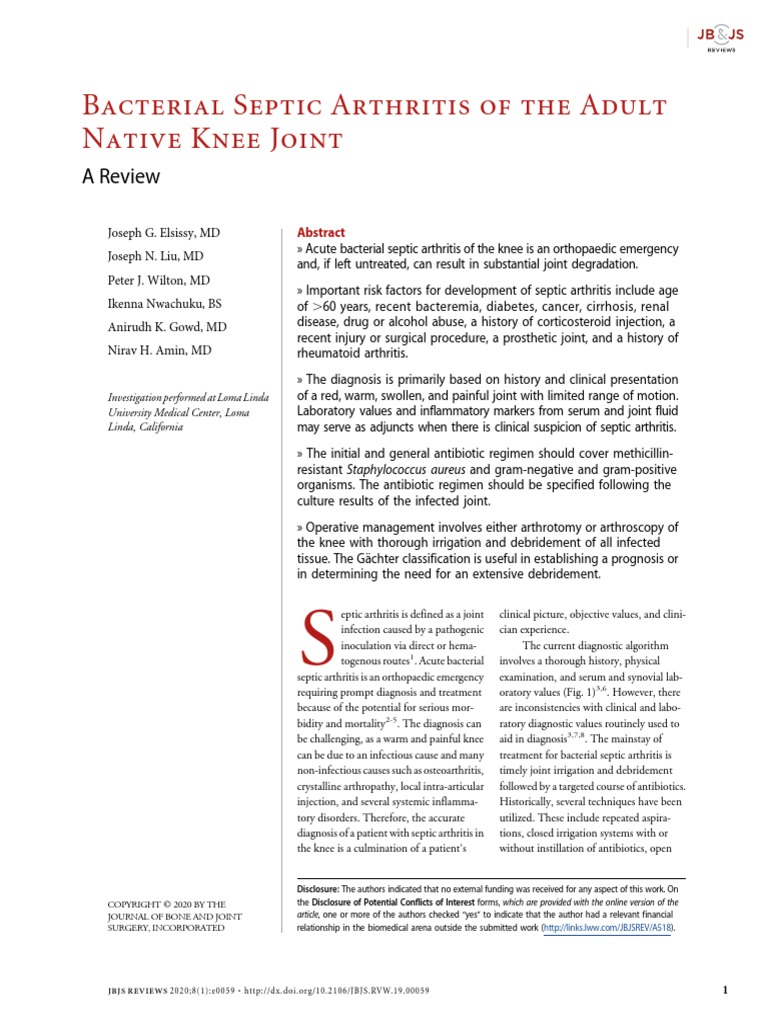anterior cruciate ligament reconstruction. Clin 830857. Epub 2014 Feb 13. infection in septic arthritis of native joints.