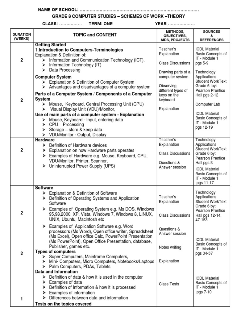 GRADE 8 COMPUTER STUDIES – SCHEMES OF WORK –THEORY