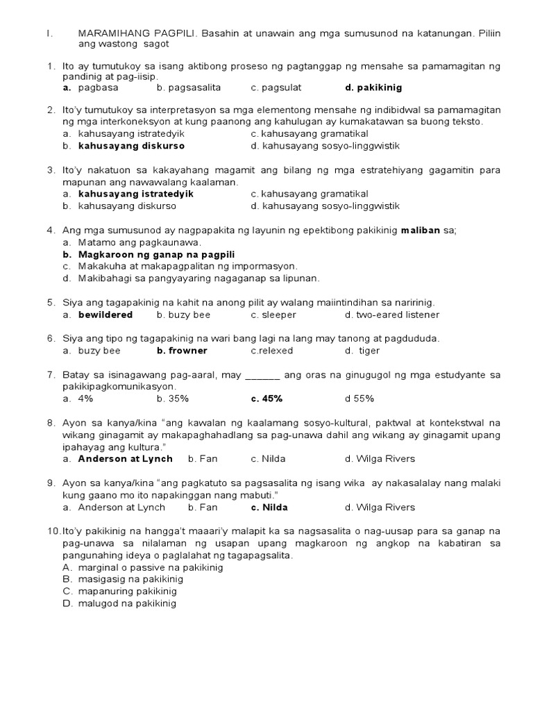 I. MARAMIHANG PAGPILI. Basahin at unawain ang mga sumusunod na katanungan.