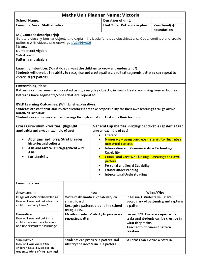 Learning Area: Mathematics Unit Title: Patterns in play Year level(s):
