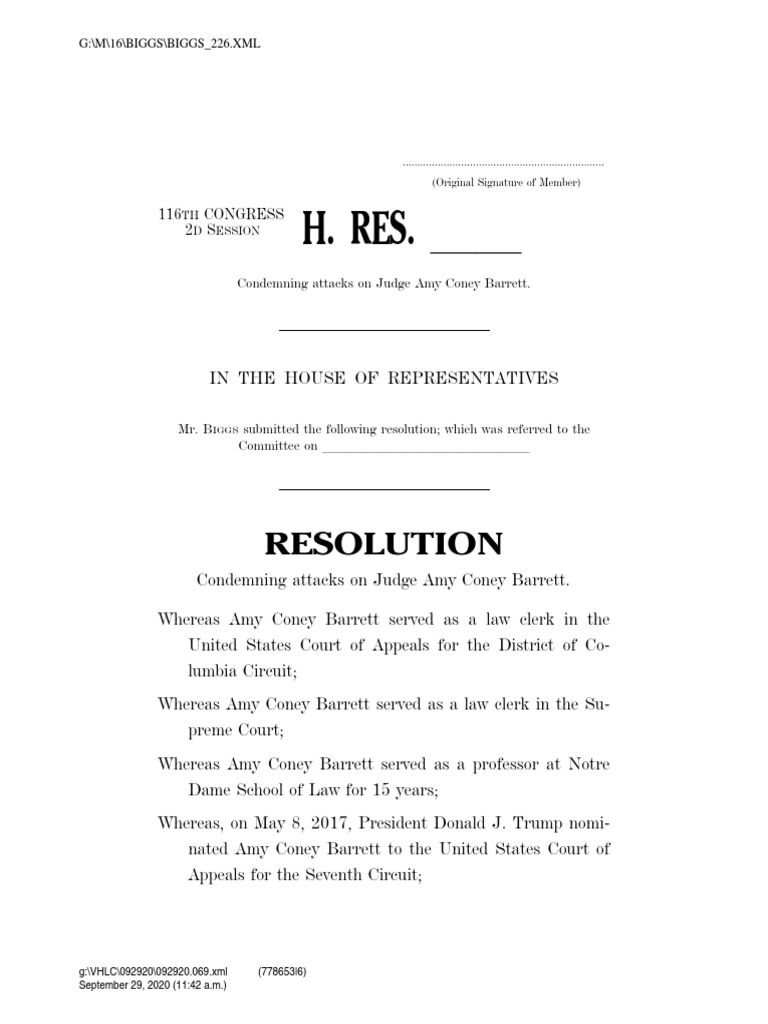 2 Whereas, on October 31, 2017, Amy Coney Barrett was con-firmed by the Senate to the United States Court of Ap-peals for the Seventh Circuit with bipartisan support; Whereas, on September 26, 2020, President Donald J. Trump nominated Judge Amy Coney Barrett to the Su-preme Court; Whereas Judge Amy Coney Barrett has successfully balanced faith, family, and professional responsibilities, including adopting two children from Haiti; Whereas Judge Amy Coney Barrett loves the Constitution and respects the original intent of America’s Founding Fathers in drafting the Constitution and Bill of Rights; Whereas, since the start of her Senate confirmation hearing in 2017, Judge Amy Coney Barrett has faced unwar-ranted attacks on her constitutional right to exercise her religious faith; Whereas Senator Diane Feinstein attacked Judge Amy Coney Barrett’s faith during her 2017 Senate confirmation hearing by stating ‘‘the dogma lives loudly within you’’; Whereas Senator Mazie Hirono recently stated that Judge Amy Coney Barrett’s religious views should not be off- limits in the upcoming Supreme Court confirmation hear-ings; Whereas in a recent Committee hearing in the House of Rep-resentatives, a Member of Congress stated that ‘‘(Catho-lics) shouldn’t have a monopoly on the bench’’; Whereas a recent Reuters Politics headline about Judge Amy Coney Barrett read: ‘‘Handmaid’s Tale? U.S. Supreme Court candidate’s religious community under scrutiny.’’;