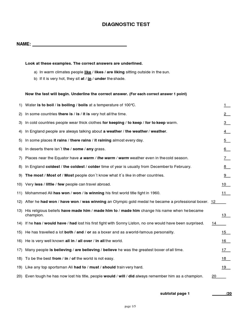 Now the test will begin. Underline the correct answer. (For each correct answer 1 point)