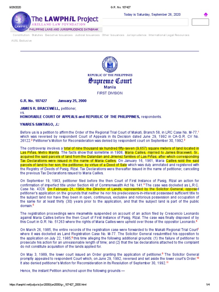 Las Piñas, Metro Manila. The facts show that sometime in 1908, Maria Cailles, married to James Bracewell, Sr.,