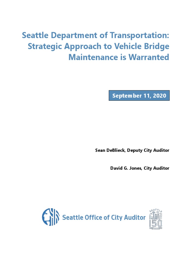 The unexpected closure of the West Seattle High Bridge in March of 2020 raises questions about the adequacy of the City’s oversight of its bridge portfolio. Seattle City Councilmember Alex Pedersen requested this audit to assess the physical condition of and maintenance investments in vehicle bridges in Seattle.