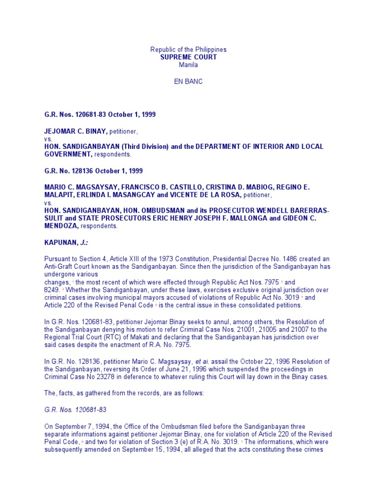 separate informations against petitioner Jejomar Binay, one for violation of Article 220 of the Revised