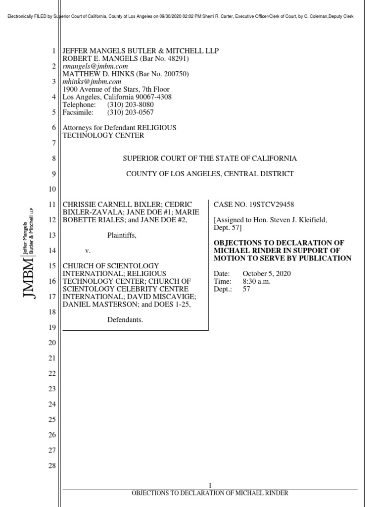 1900 Avenue of the Stars, 7th Floor Los Angeles, California 90067-4308 Telephone: (310) 203-8080 Facsimile: (310) 203-0567 Attorneys for Defendant RELIGIOUS TECHNOLOGY CENTER SUPERIOR COURT OF THE STATE OF CALIFORNIA COUNTY OF LOS ANGELES, CENTRAL DISTRICT CHRISSIE CARNELL BIXLER; CEDRIC BIXLER-ZAVALA; JANE DOE #1; MARIE BOBETTE RIALES; and JANE DOE #2, Plaintiffs, v. CHURCH OF SCIENTOLOGY INTERNATIONAL; RELIGIOUS TECHNOLOGY CENTER; CHURCH OF SCIENTOLOGY CELEBRITY CENTRE INTERNATIONAL; DAVID MISCAVIGE; DANIEL MASTERSON; and DOES 1-25, Defendants. CASE NO. 19STCV29458 [Assigned to Hon. Steven J. Kleifield, Dept. 57]