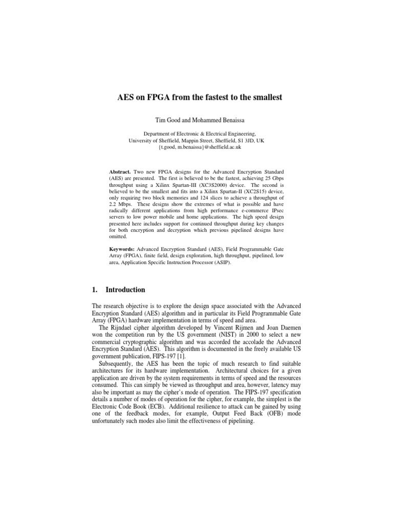 [4] P. Chodowiec, K. Gaj, Very Compact FPGA Implementation of the AES Algorithm,