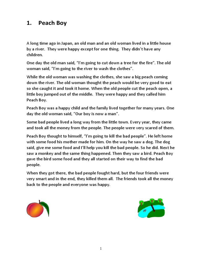 saw a monkey and the same thing happened. Then they saw a bird. Peach Boy