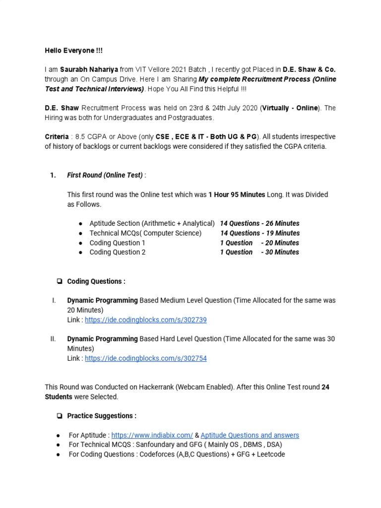 D.E. Shaw Recruitment Process was held on 23rd & 24th July 2020 (Virtually - Online). The