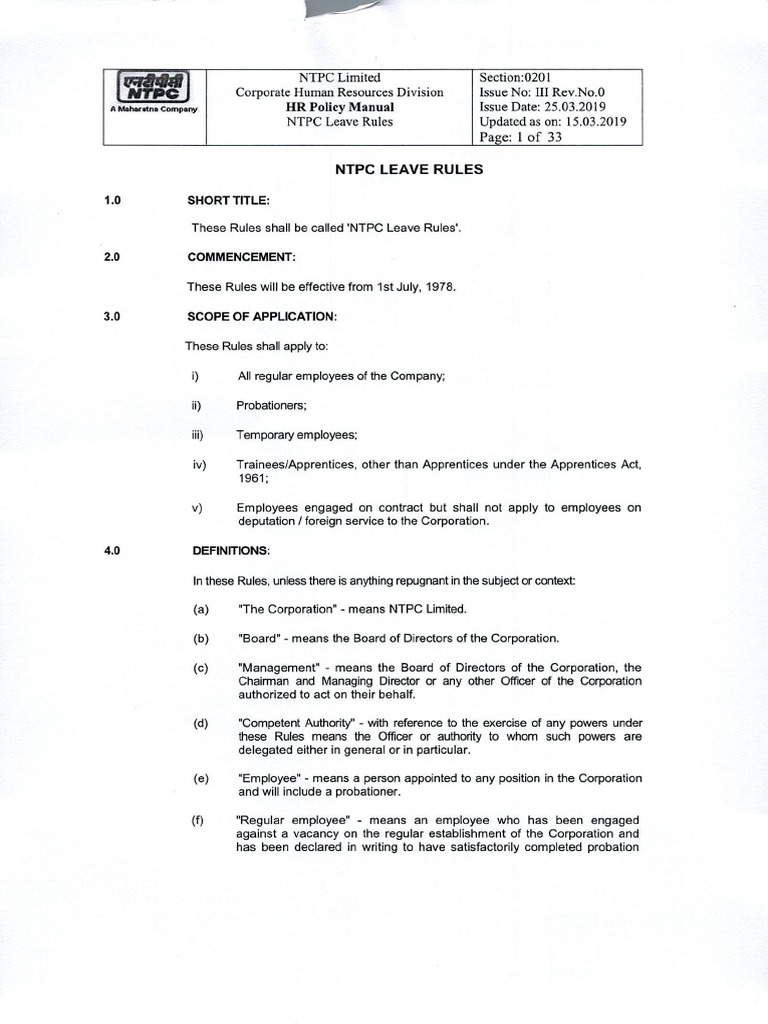 NTPC Leave Rules Updated as on: 15.03.2019 |