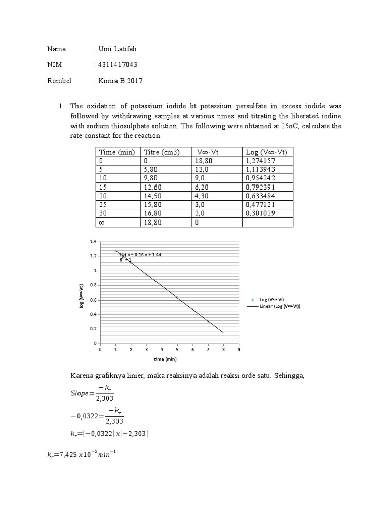 Tunjukkan bahwa reaksi berorde 1 dan hitung tetapan laju reaksinya