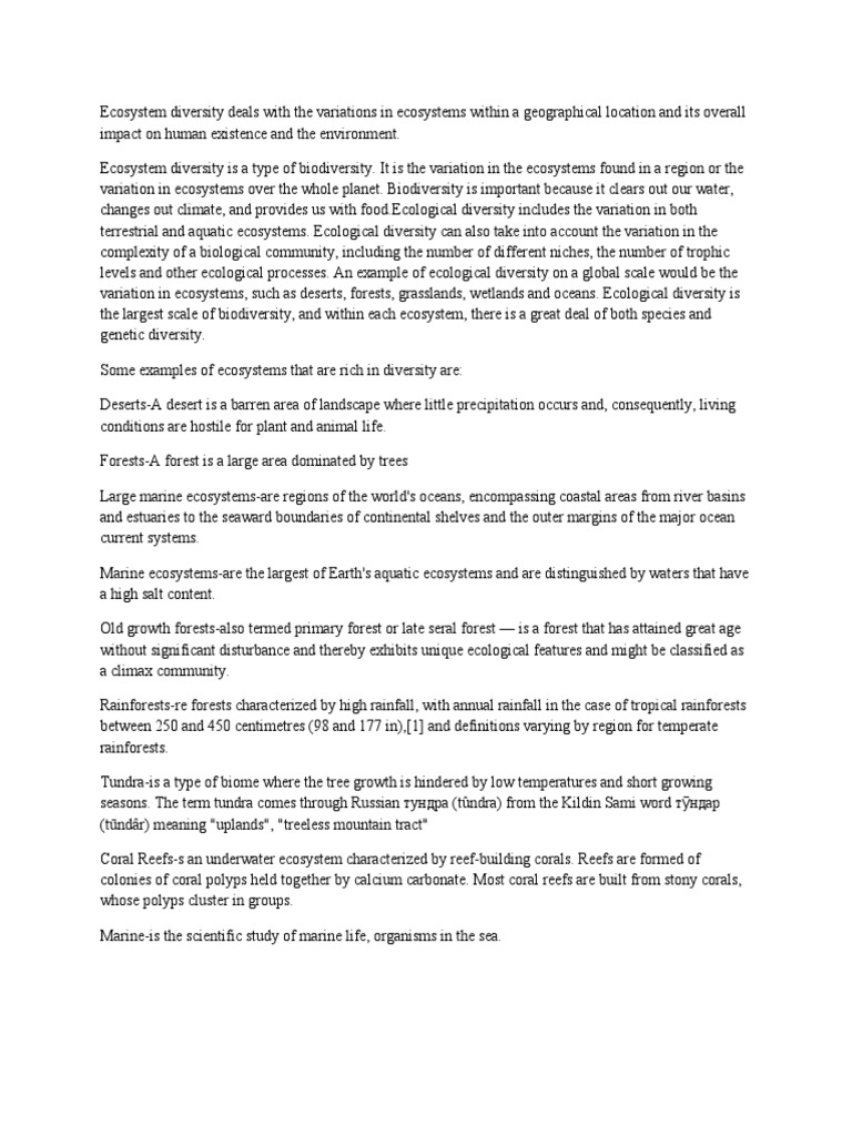Ecosystem diversity deals with the variations in ecosystems within a geographical location and its overall
