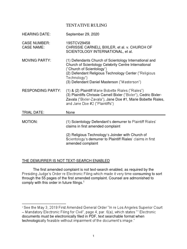 On April 30, 2020, Defendant Masterson filed a demurrer with motion to strike to the first amended complaint. On August 24, 2020, Plaintiff Riales filed an opposition to Church of Scientology demurrer that Religious Technology joined. On August 24, 2020, Plaintiffs filed an opposition to Defendant