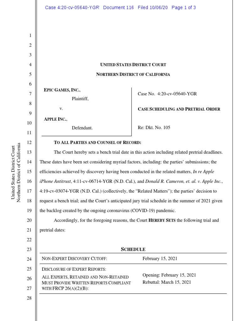 Instead of July as the Judge previously said, the Apple versus Epic bench trial begins on May 3, 2021