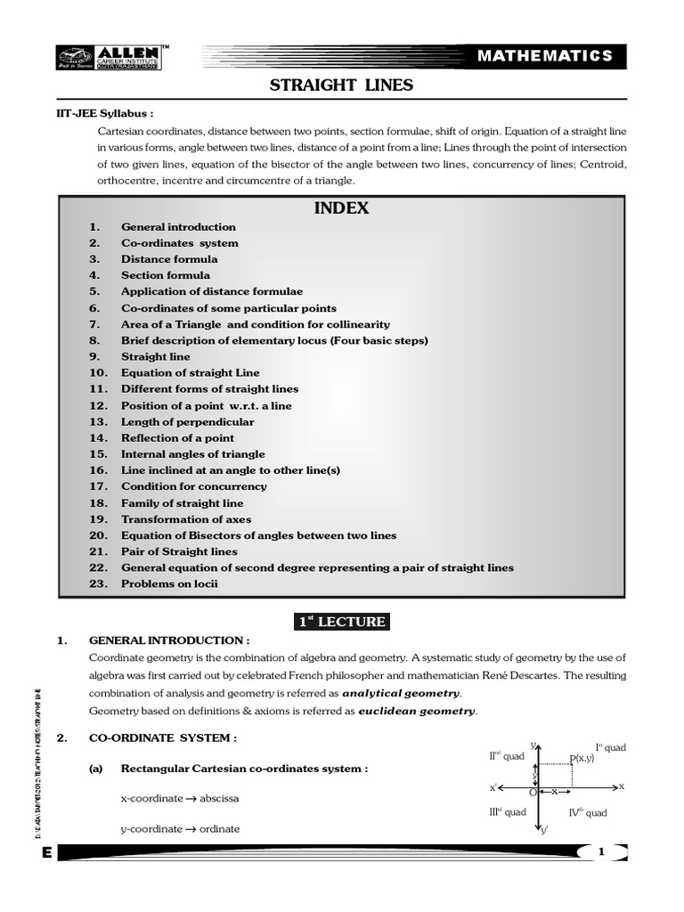 Cartesian coordinates, distance between two points, section formulae, shift of origin. Equation of a straight line