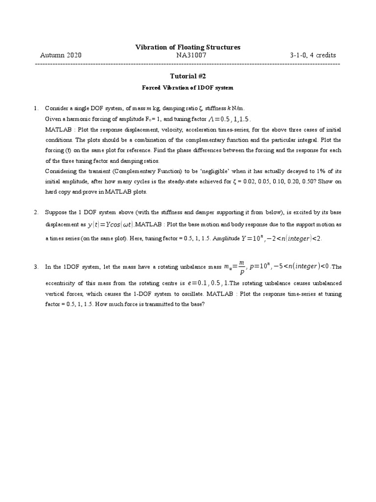 1. Consider a single DOF system, of mass m kg, damping ratio ζ, stiffness k N/m.