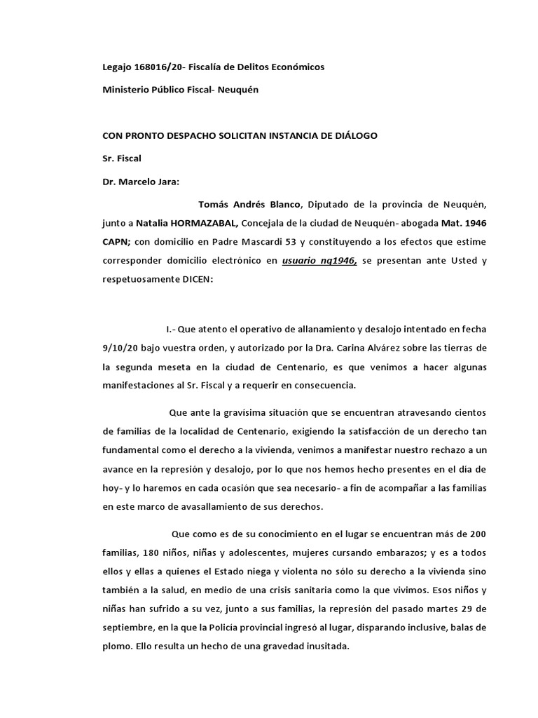Solicitan al Sr. Fiscal Dr. Marcelo Jara una URGENTE mesa de diálogo con representantes del Municipio de Centenario, autoridades provinciales y representantes de las familias.