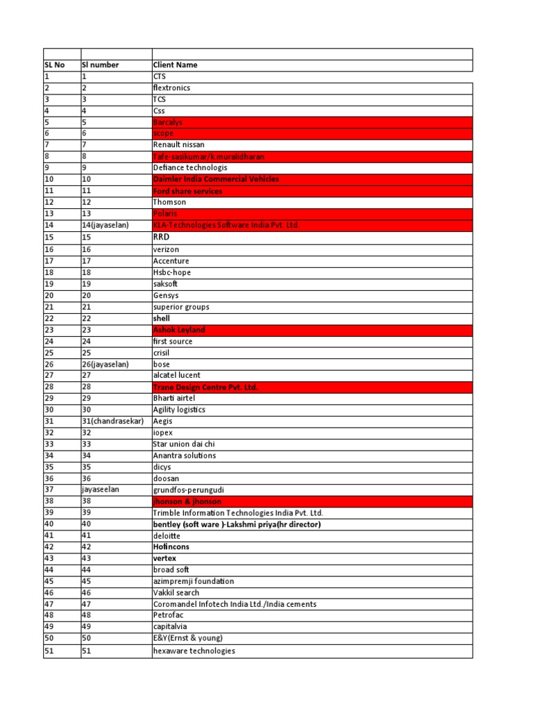 SL No Sl number Client Name