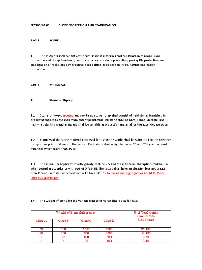 1.4 The weight of stone for the various classes of riprap shall be as follows: