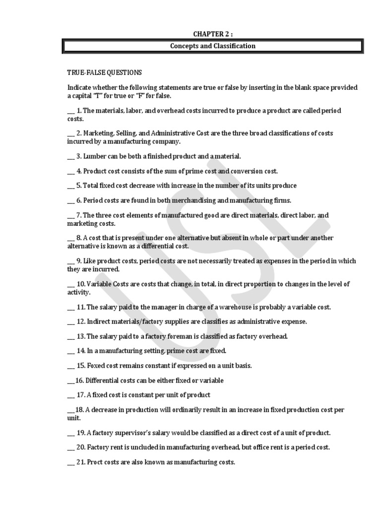 ___ 7. The three cost elements of manufactured good are direct materials, direct labor, and