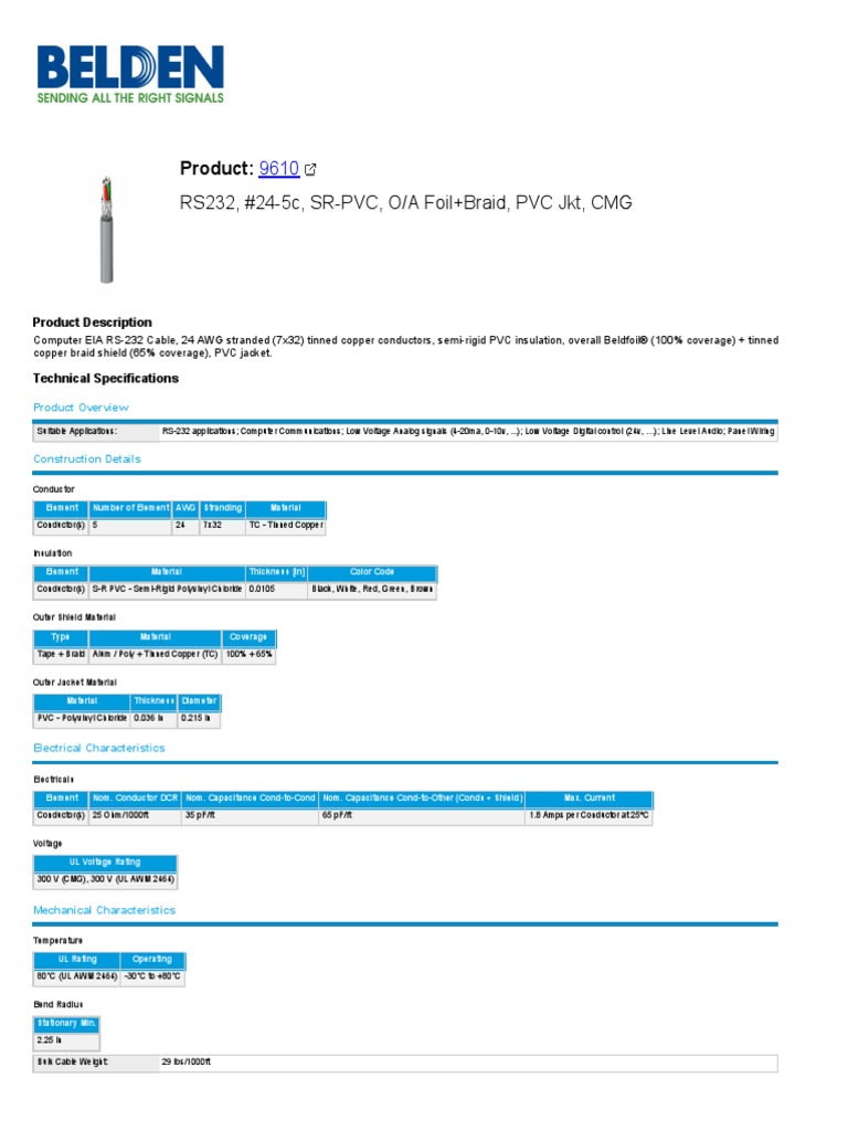 Computer EIA RS-232 Cable, 24 AWG stranded (7x32) tinned copper conductors, semi-rigid PVC insulation, overall Beldfoil® (100% coverage) + tinned