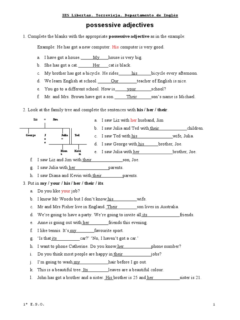 1. Complete the blanks with the appropriate possessive adjective as in the example: