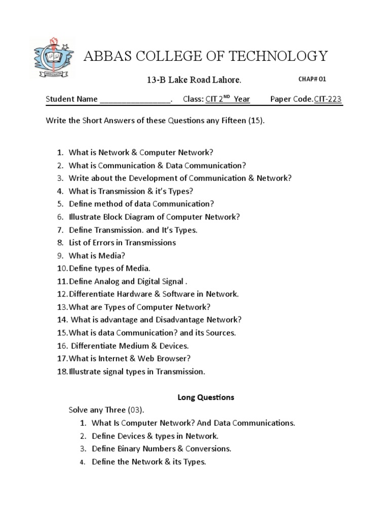 Student Name ________________. Class: CIT 2ND Year Paper Code.CIT-223