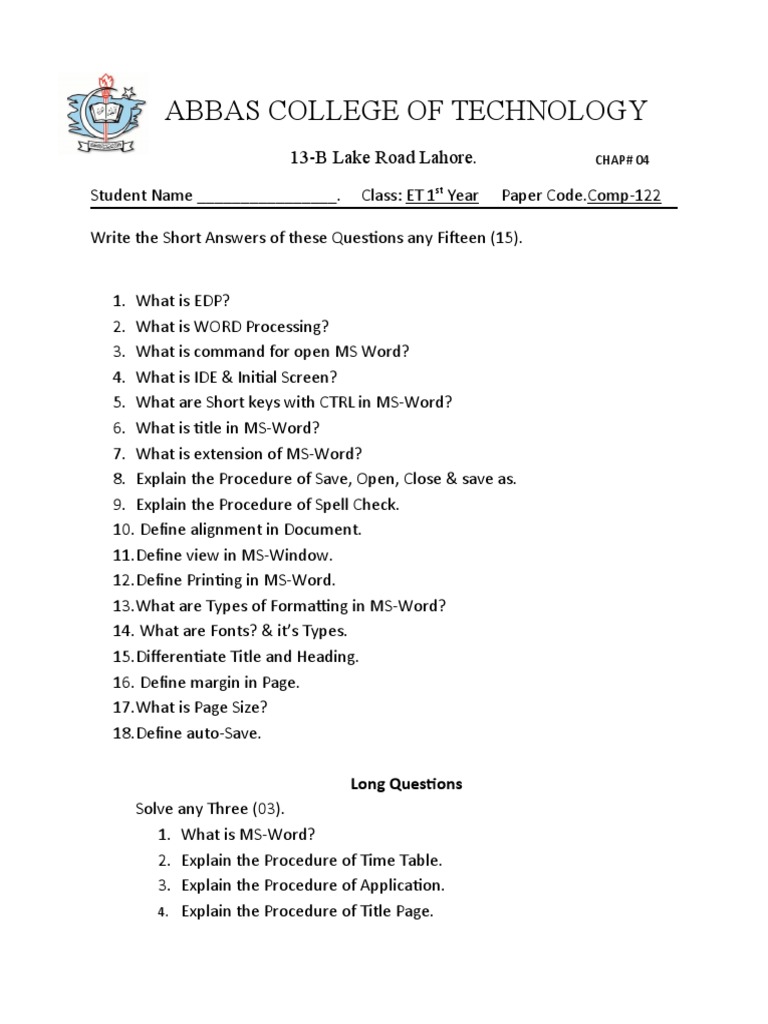 Student Name ________________. Class: ET 1st Year Paper Code.Comp-122