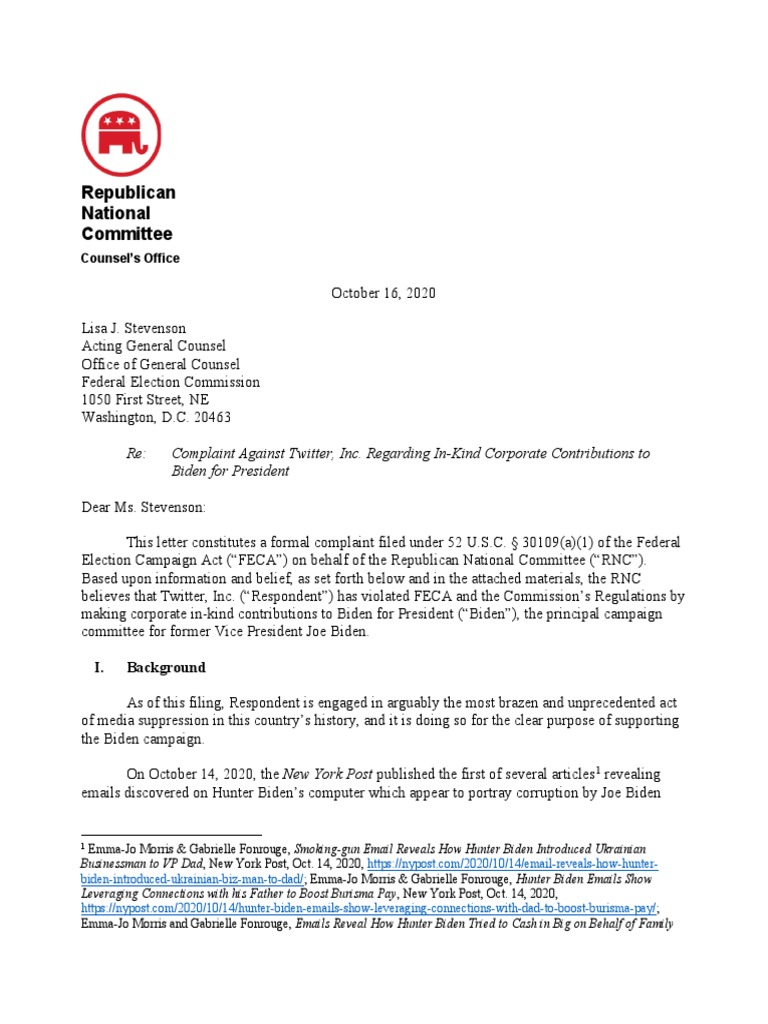 Dear Ms. Stevenson: This letter constitutes a formal complaint filed under 52 U.S.C. § 30109(a)(1) of the Federal Election Campaign Act (“FECA”) on behalf of the Republican National Committee (“RNC”). Based upon information and belief, as set forth below and in the attached materials, the RNC believes that Twitter, Inc. (“Respondent”) has violated FECA and the Commission’s Regulations by making corporate in-kind contributions to Biden for President (“Biden”), the principal campaign committee for former Vice President Joe Biden.