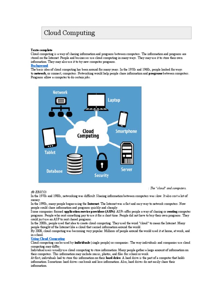 Cloud computing is a way of sharing information and programs between computers. The information and programs are