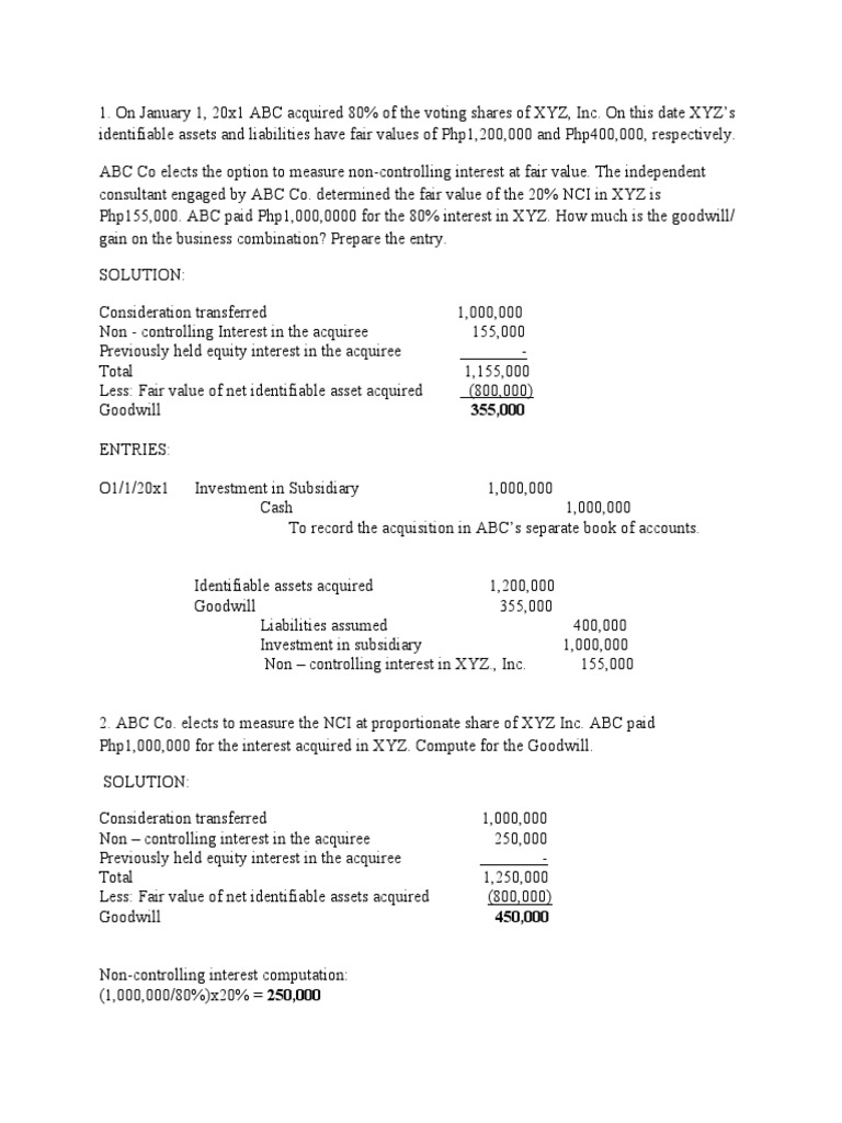1. On January 1, 20x1 ABC acquired 80% of the voting shares of XYZ, Inc.