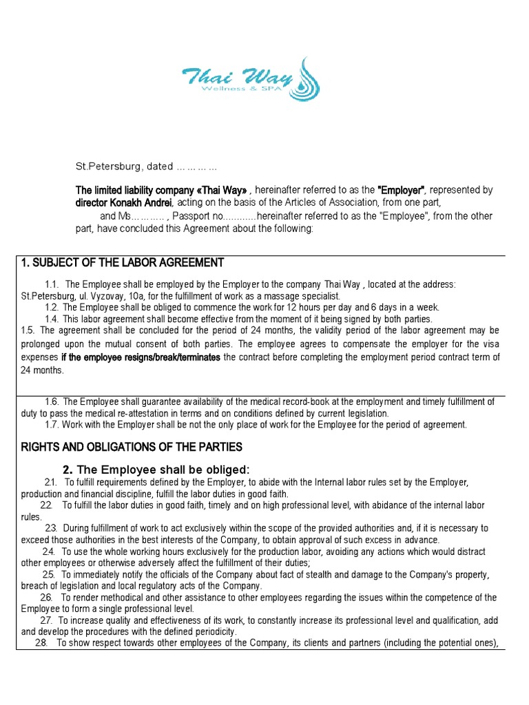 The limited liability company «Thai Way» , hereinafter referred to as the "Employer", represented by