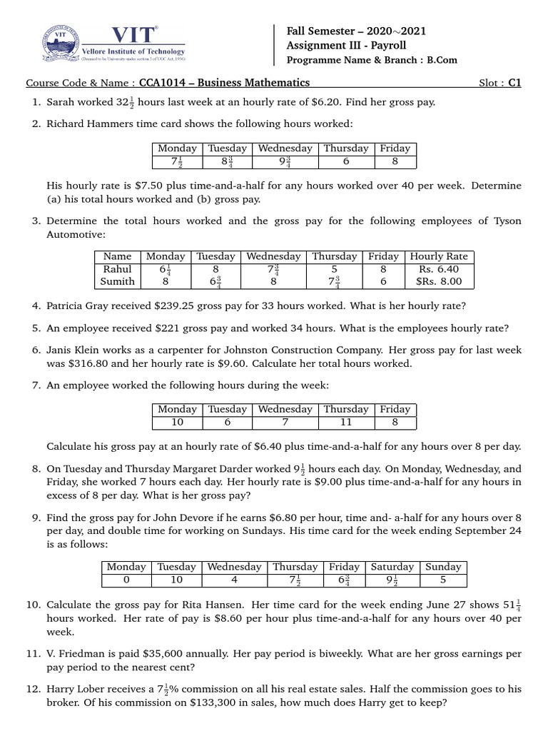 1. Sarah worked 32 12 hours last week at an hourly rate of $6.20. Find her gross pay.