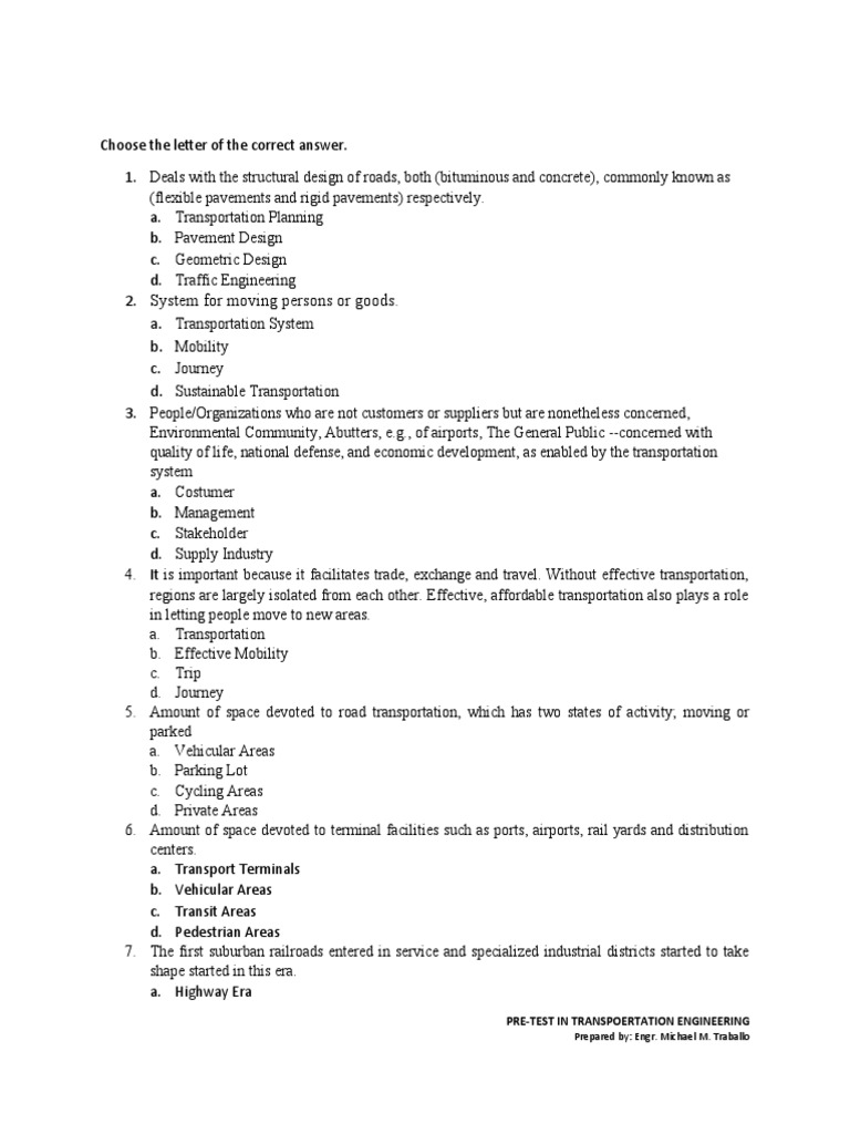PRE-TEST IN TRANSPOERTATION ENGINEERING