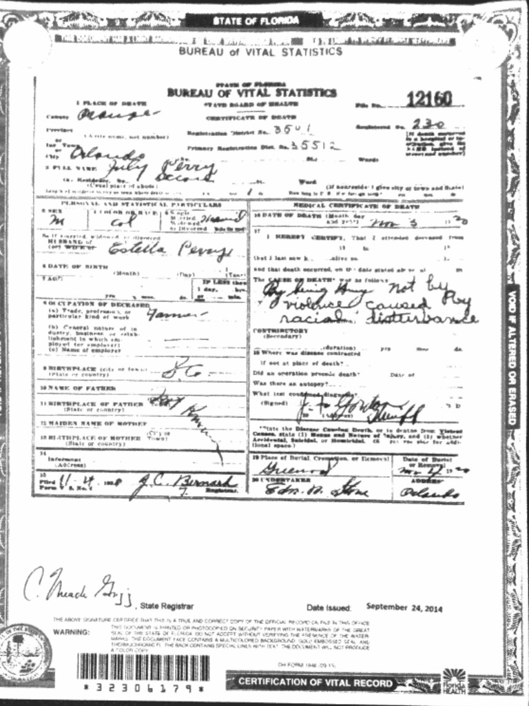 This is the death certificate for Julius 'July' Perry, an Ocoee resident who was murdered by a lynch mob on Election Day in 1920.