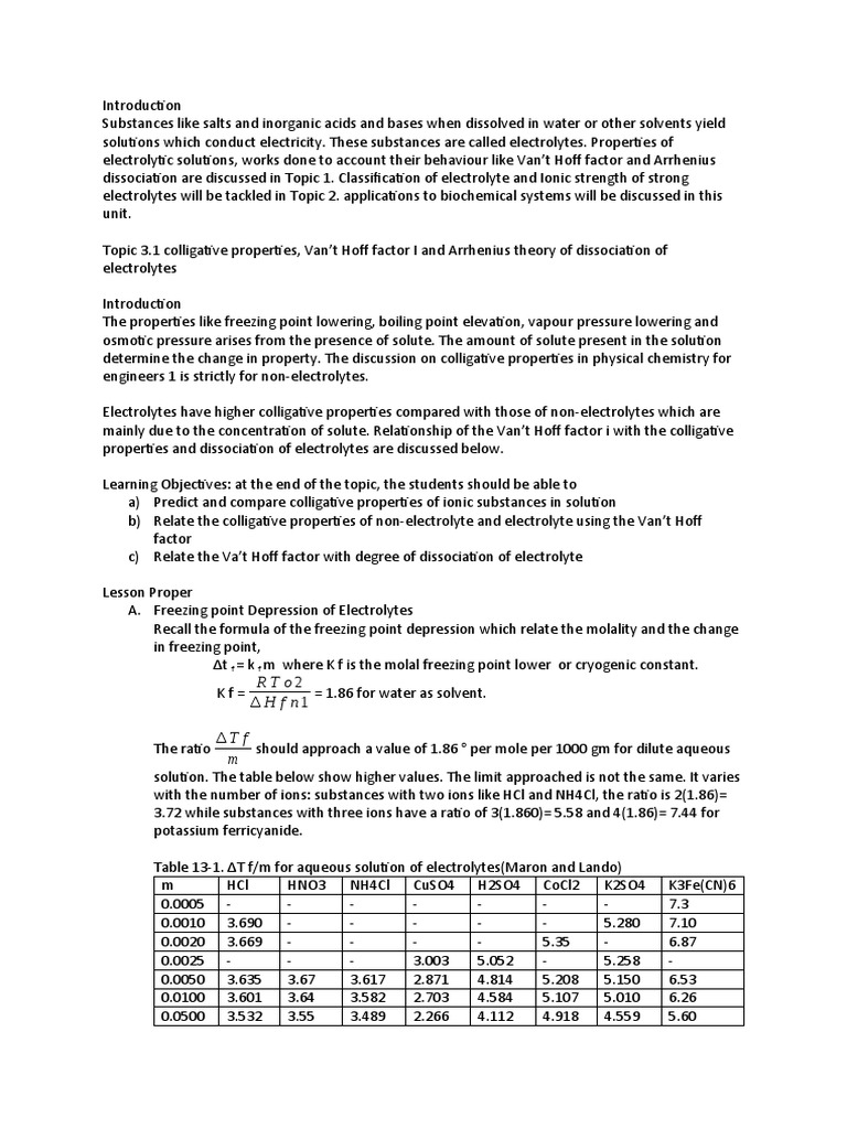 Topic 3.1 colligative properties, Van’t Hoff factor I and Arrhenius theory of dissociation of